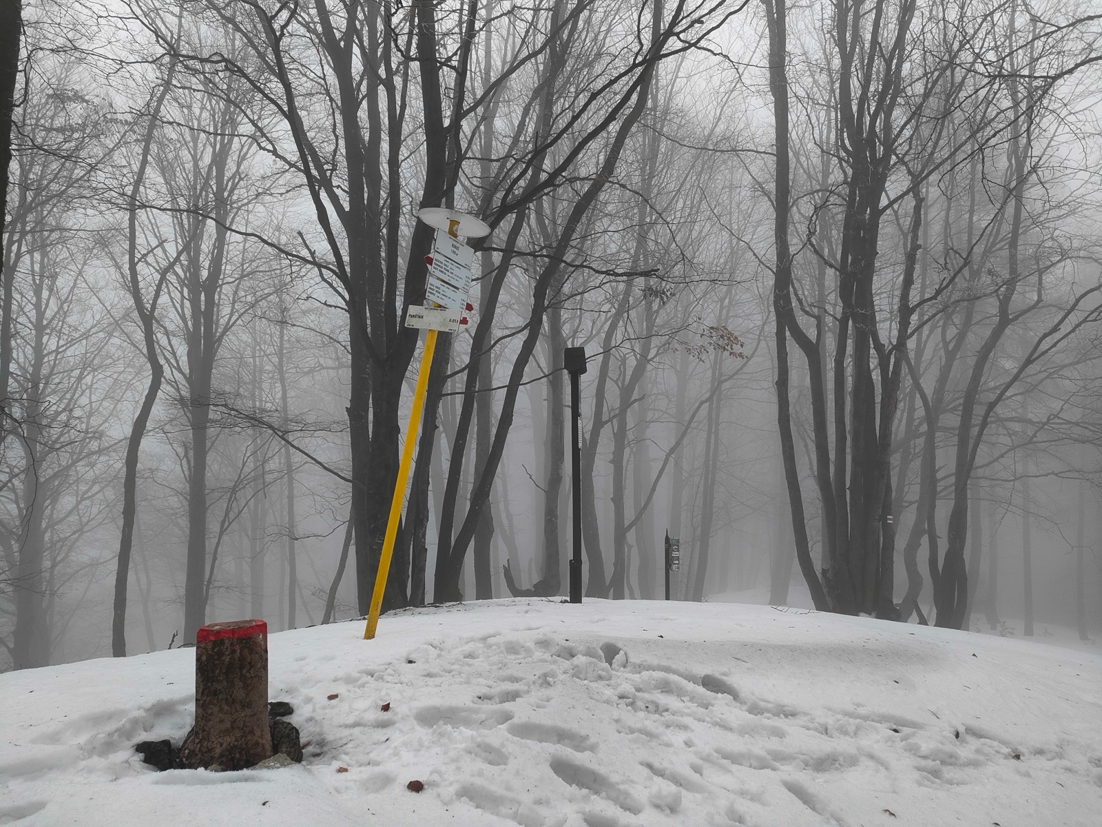 Sme tu! Takmer sme nezbadali vrcholový turistický smerovník kvôli hmle. Výhľady tu nie sú žiadne a takisto ani stopy po ďalších turistoch. Vidíme, že pár desiatok metrov vedľa je turistický prístrešok, kam si ideme sadnúť a načerpať ďalšie sily. Prístrešok na naše prekvapenie ponúka na poschodí aj miesto na prespanie. Predstavujeme si, aká idylka tu musí byť počas teplých letných nocí. Neďaleko tohto miesta je aj miesto s rozhľadom na krajinu ale keďže dnešná oblačnosť mu zabraňuje, tak si pomaly pobalíme veci a ideme ďalej.