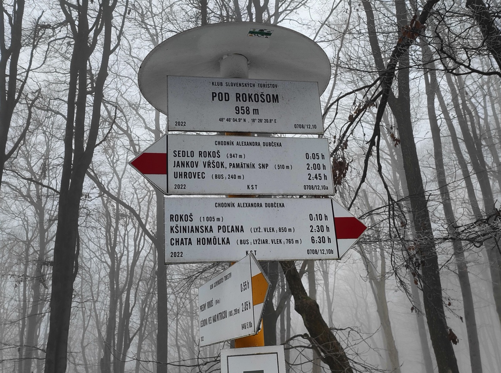 Úsek po ľavej strane je súčasťou národnej prírodnej rezervácie Rokoš aj s Košútovou jaskyňou. Tú však musíme obísť, pretože k nej nevedie oficiálna trasa. Ako pokračujeme ďalej hmla začína hustnúť a viditeľnosť sa každým ďalším prejdeným metrom znižuje. Predpokladali sme, že s pribúdajúcim časom to bude lepšie, avšak meteorologické podmienky majú evidentne iné plány. Ako pozeráme do kartografického diela TM VKÚ 131 Horná Nitra • Vtáčnik • Strážovské vrchy, vidíme, že dnešný najvyšší bod v podobe Rokoša (1 010 m n. m.) by mal byť už neďaleko.