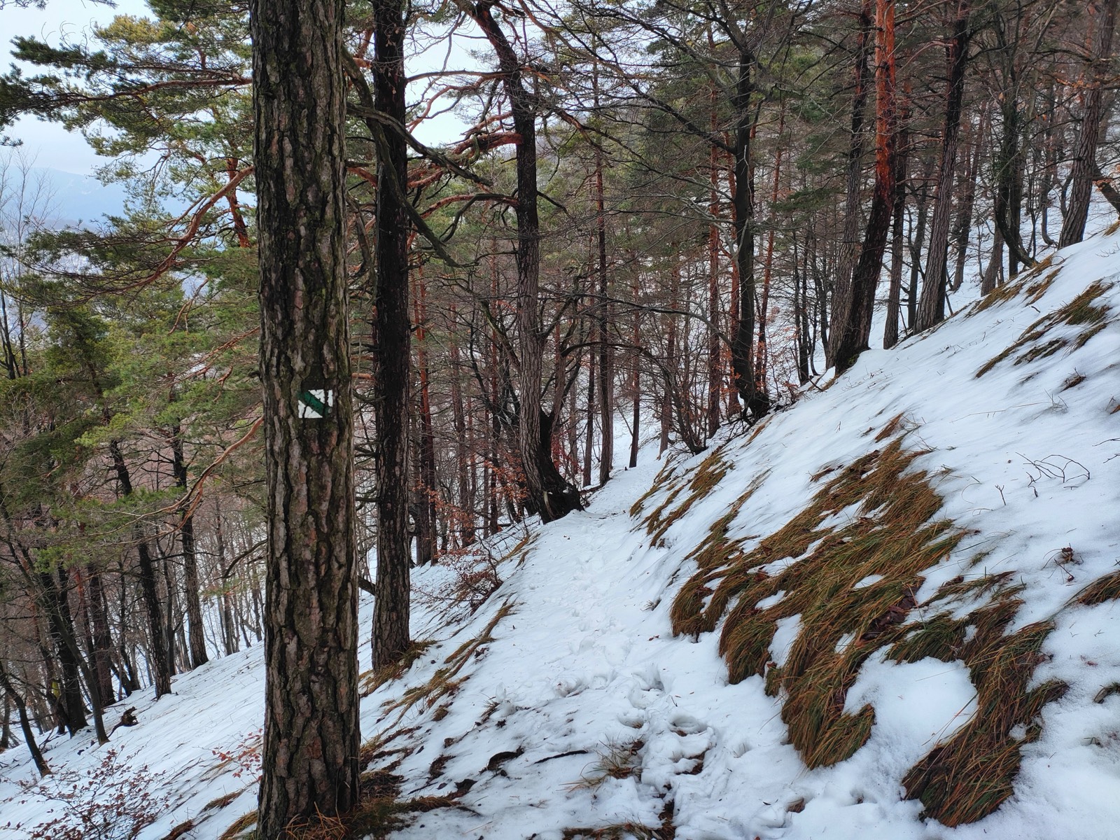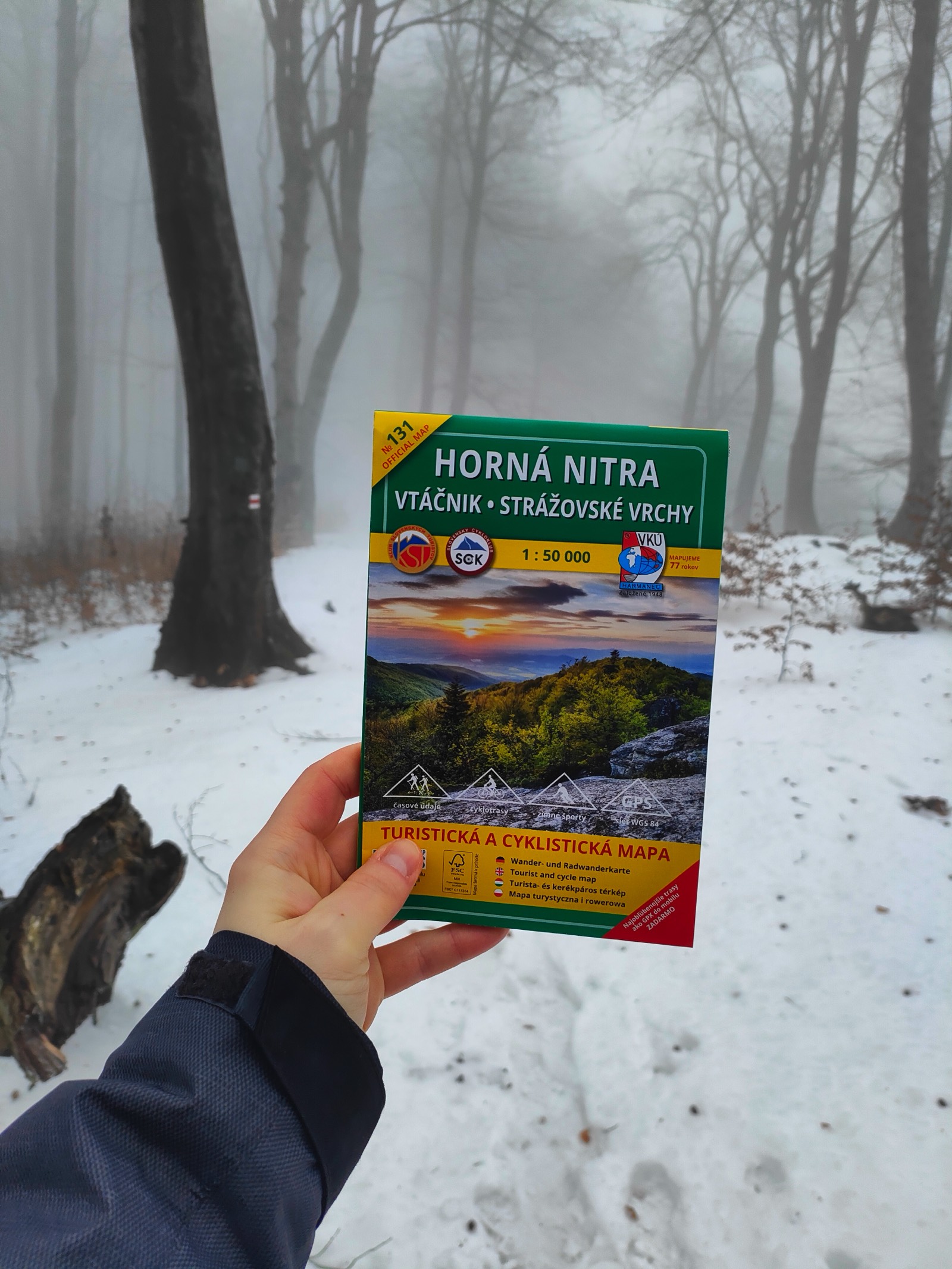 Ako oddychujeme pri Košútovej skale a obdivujeme ponúkané výhľady, ktorých dnes nebude mnoho, tak si pomaly balíme veci do ruksaka a pripravujeme sa na ďalšie pokračovanie. Pred nami je chodník hrebeňom Strážovských vrchov, konkrétne Nitrických vrchov. Najväčšie prevýšenie je už úspešne za nami, tak veríme, že nasledujúci úsek bude o niečo príjemnejší a bezpečnejší. Na doterajších úsekoch sme mali miestami problémy vzhľadom na snehový podklad spojený s blatom a popadaným lístím.