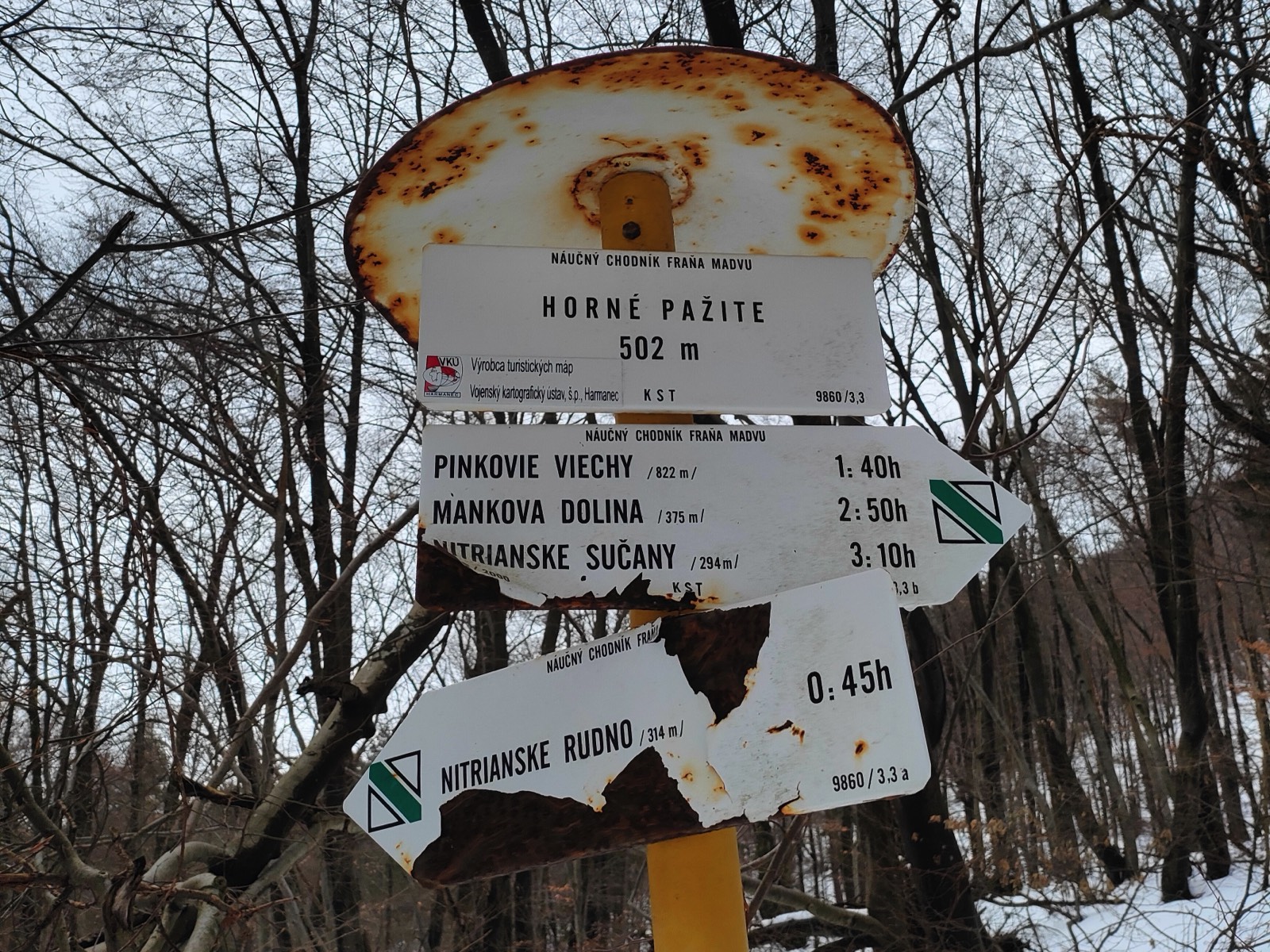 Postupne klesáme od vrchu Plevňa a sme radi, že ideme práve týmto smerom. Na tomto úseku stretávame aj prvých turistov dnešného dňa. Za niekoľko desiatok minút prichádzame k smerovníku oznamujúcemu lokalitu Horné pažite a nadmorskú výšku 502 m. V tomto bode sa nachádza aj náučná tabuľa, kde sa dozvedáme zaujímavé informácie o okolitej flóre.
