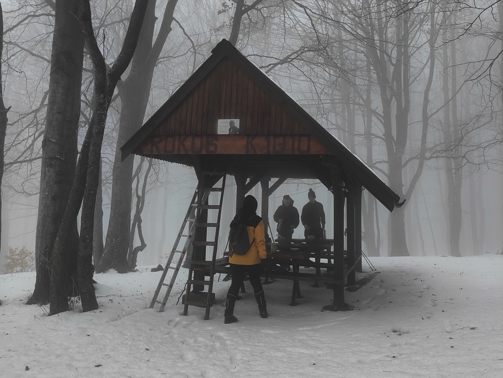 Sme tu! Takmer sme nezbadali vrcholový turistický smerovník kvôli hmle. Výhľady tu nie sú žiadne a takisto ani stopy po ďalších turistoch. Vidíme, že pár desiatok metrov vedľa je turistický prístrešok, kam si ideme sadnúť a načerpať ďalšie sily. Prístrešok na naše prekvapenie ponúka na poschodí aj miesto na prespanie. Predstavujeme si, aká idylka tu musí byť počas teplých letných nocí. Neďaleko tohto miesta je aj miesto s rozhľadom na krajinu ale keďže dnešná oblačnosť mu zabraňuje, tak si pomaly pobalíme veci a ideme ďalej.