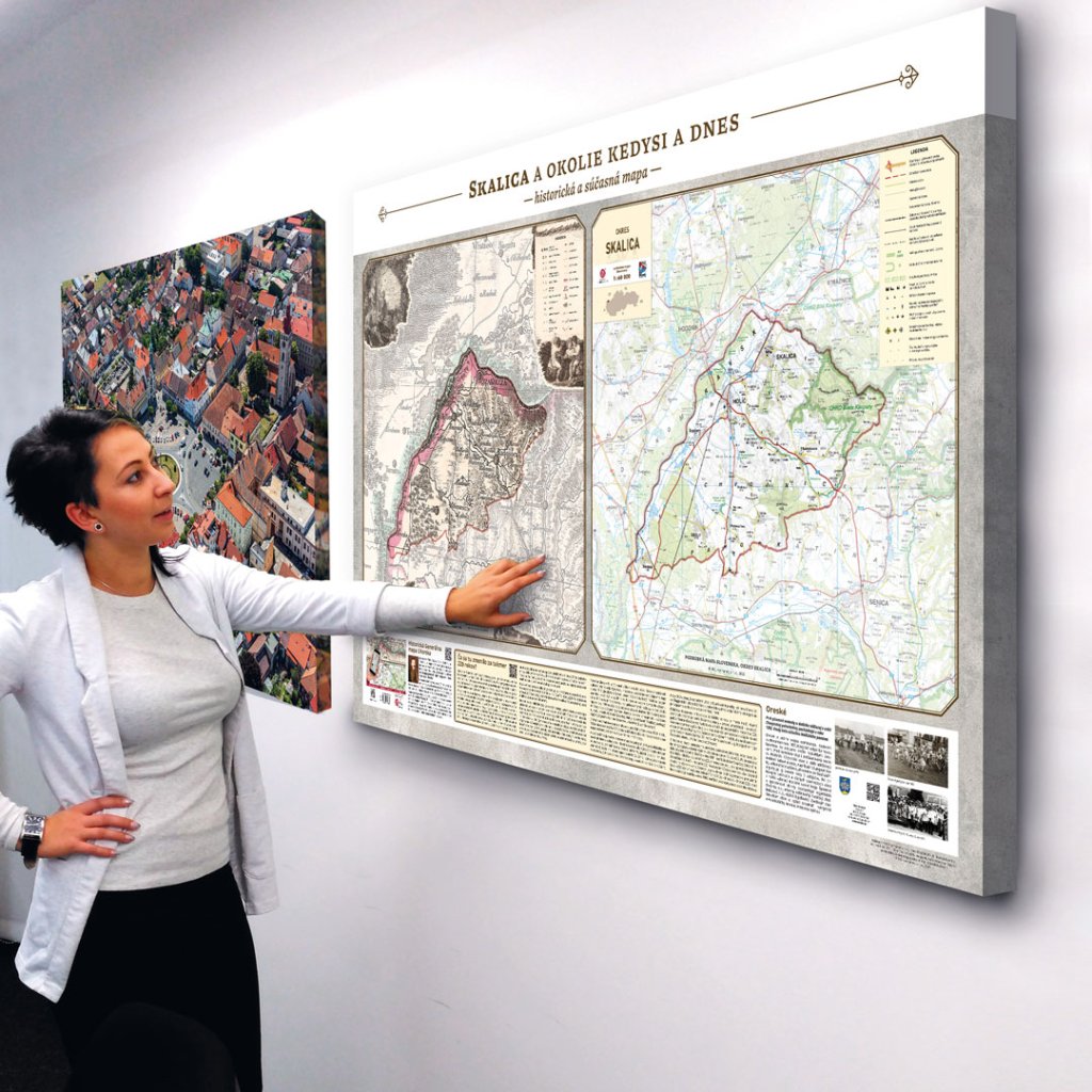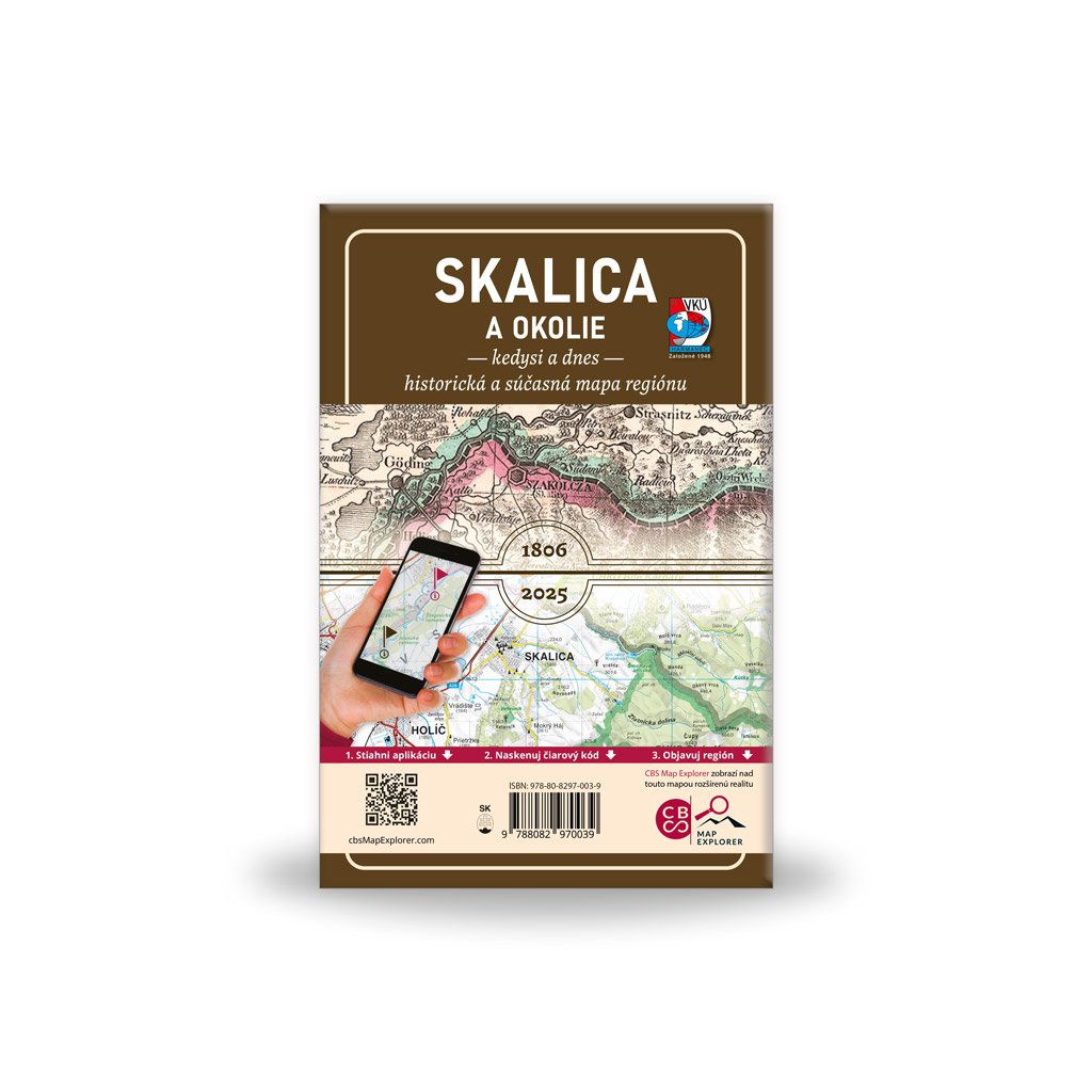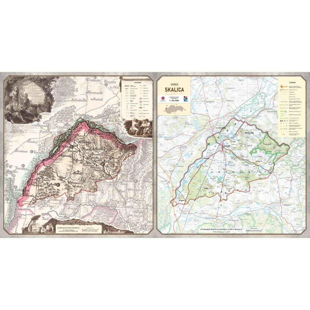 Na jednej strane nájdete detailnú historickú mapu z roku 1806 od významného kartografa Jána Lipského, známej ako Mappa generalis regni Hungariae, považovanej za jednu z najpresnejších máp 19. storočia. Na druhej strane je súčasná mapa Skalice, ktorá zachytáva aktuálny stav krajiny, miest a obcí.