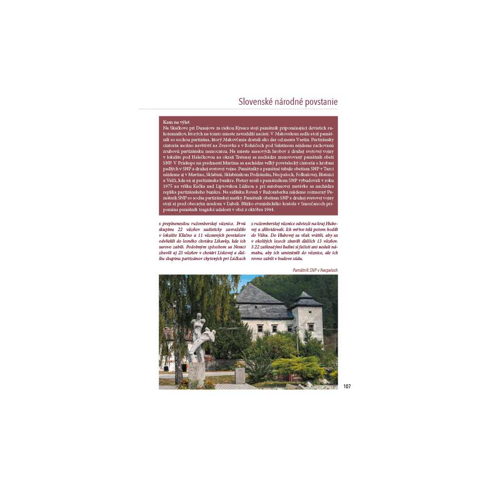 Obrovský a priamy dopad na Slovensko mali obidve svetové vojny, Slovenské národné povstanie či holokaust, ktorý dosiahol aj u nás obludné rozmery. Kniha prináša podrobný prehľad miest, kde sa tieto tragédie na Slovensku odohrali. Prostredníctvom nej čitateľ hlbšie porozumie ich historickému významu a pomocou textu a mnohých ilustrácií si lepšie predstaví udalosti, ktoré zohrali kľúčovú úlohu v dejinách Slovenska 20. storočia.