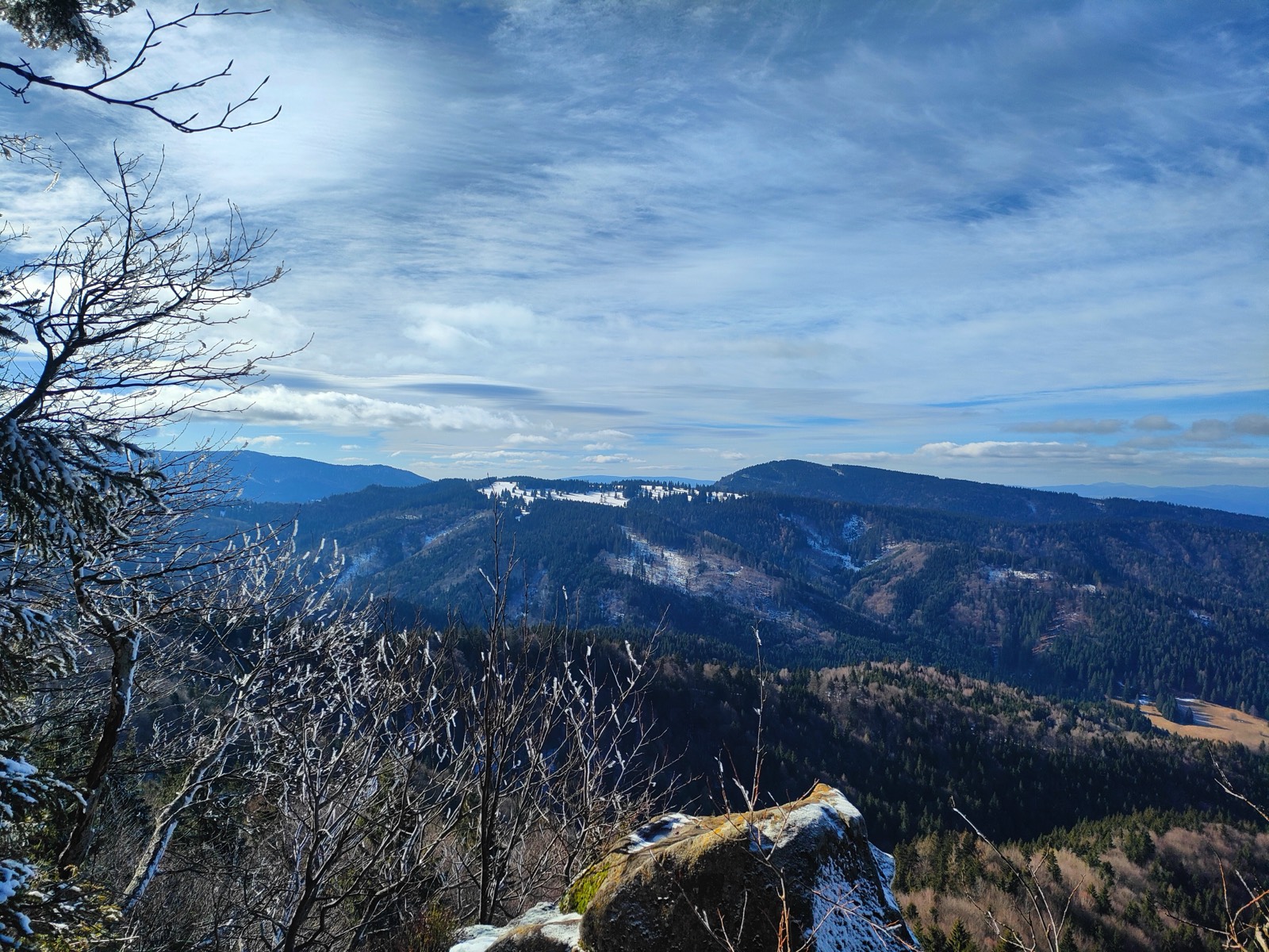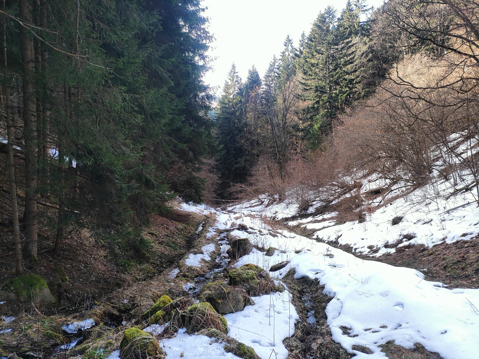 Mierne vychodenou trasou sa dostávame nižšie a aj napriek miestami sťaženej orientácii prichádzame na asfaltovú cestu. Cesta vedia popri potoku Hutná. Sú tu ešte namrznuté úseky na ceste, takže ideme opatrne vzhľadom na to, že sme si dnes so sebou nezobrali mačky vhodné na takéto pasáže. Ľad neskôr mizne a tak je pred nami už len asfaltová cesta vedúca cez chatovú oblasť. Je tu príjemný pokoj. Vyzerá, že o chaty je dobre postarané a zamýšľame sa nad tým, aké skvelé by bolo taktiež jednu takúto mať v obkolesení takejto nádhernej prírody.