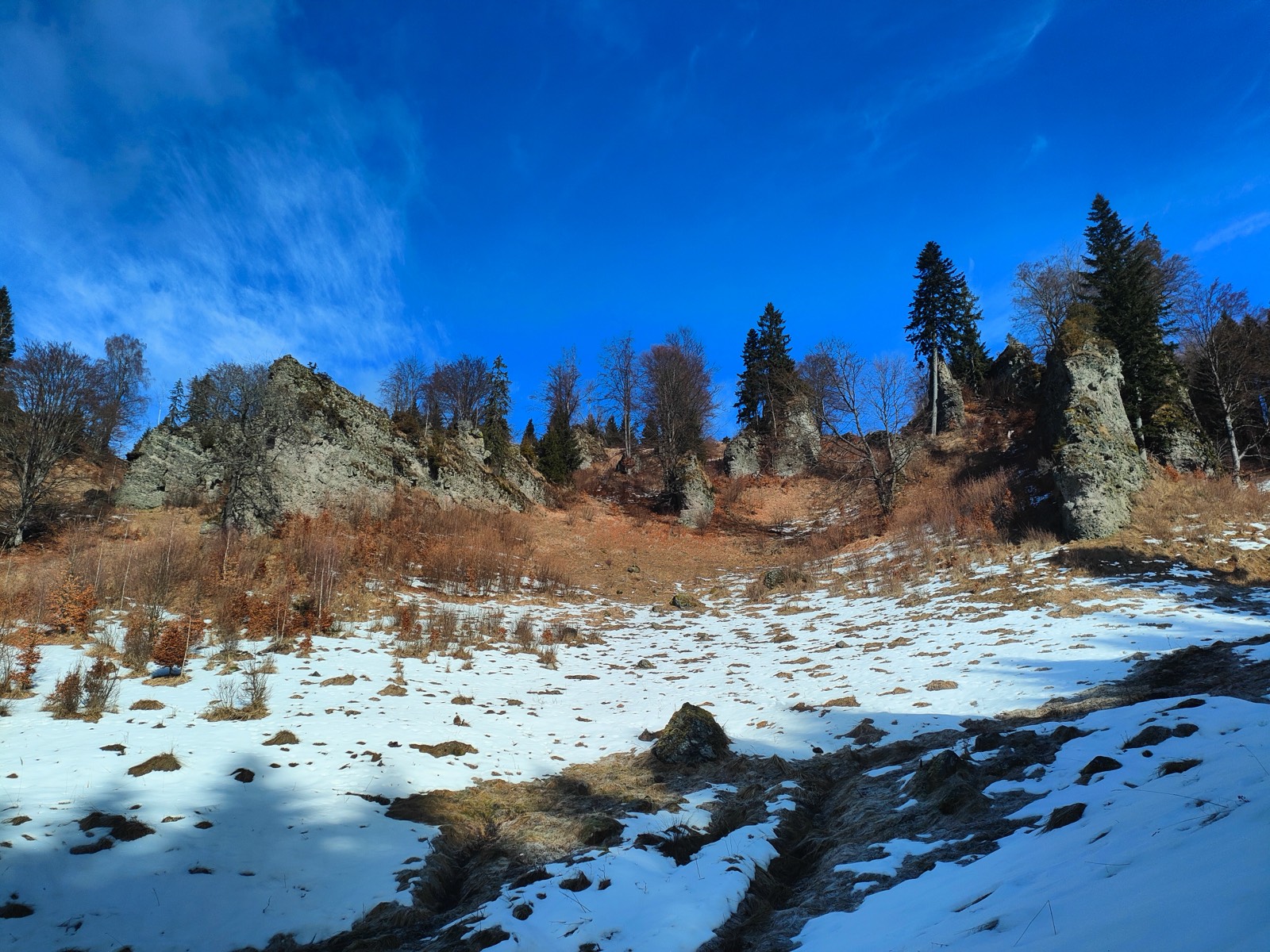 Z Vepra začína klesanie, ktorým ideme ďalej smerom na Hájny grúň. Mimochodom na tom vrchu je geometrický stred Slovenska. Určite sa aj tam budeme chcieť ísť niekedy pozrieť. Dnes to však nebude, pretože máme iné plány. Postupne sa dostávame na zasneženú lúku, odkiaľ vidíme aj na osrbliansku stranu, aj keď len čiastočne. Naše plány v sebe obsahujú postupné odpojenie sa vpravo a kráčanie popri Veporských skalkách označených ako prírodná pamiatka. Prudké klesanie nás dostáva čoskoro pod hranicu 1 050 m n. m., čo je približná výška, v ktorej tieto skaly ležia. Obdivujeme ich z diaľky a neveríme vlastným očiam, že len tak z ničoho tu zo zeme „vyrástla“ takáto prírodná atrakcia. Skaly vyzerajú ako základy nejakého stredovekého hradu. Je to naozaj výnimočné miesto a zachováva si svoj punc odľahlosti.
