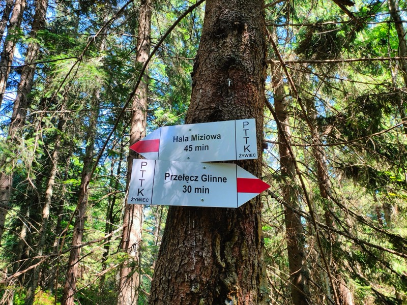 Sme na magistrále a čoskoro sa vnárame aj do prírodnej rezervácie s názvom Rezerwat Pilsko. Tá je taktiež súčasťou chránenej oblasti Żywiecki Park Krajobrazowy ustanovenej v roku 1986. Okolité porasty a krajina všeobecne ponúkajú prechádzku neopakovateľným lesom. Okamžite rozumieme tomu, prečo túto časť tak veľmi chránia. Ideme okolo menšieho potoka s názvom Glinna, ktorý dotvára jedinečnú atmosféru tohto miesta. Nečakali sme, že to bude až také podmanivé. Konverzujeme o všetkom možnom a ani nevieme ako, prichádzame ku smerovníku. Ten oznamuje, že k miestu Hliny, resp. Przełęcz Glinne, ako sa nazýva po poľsky, je to už len príjemných 30 minút.